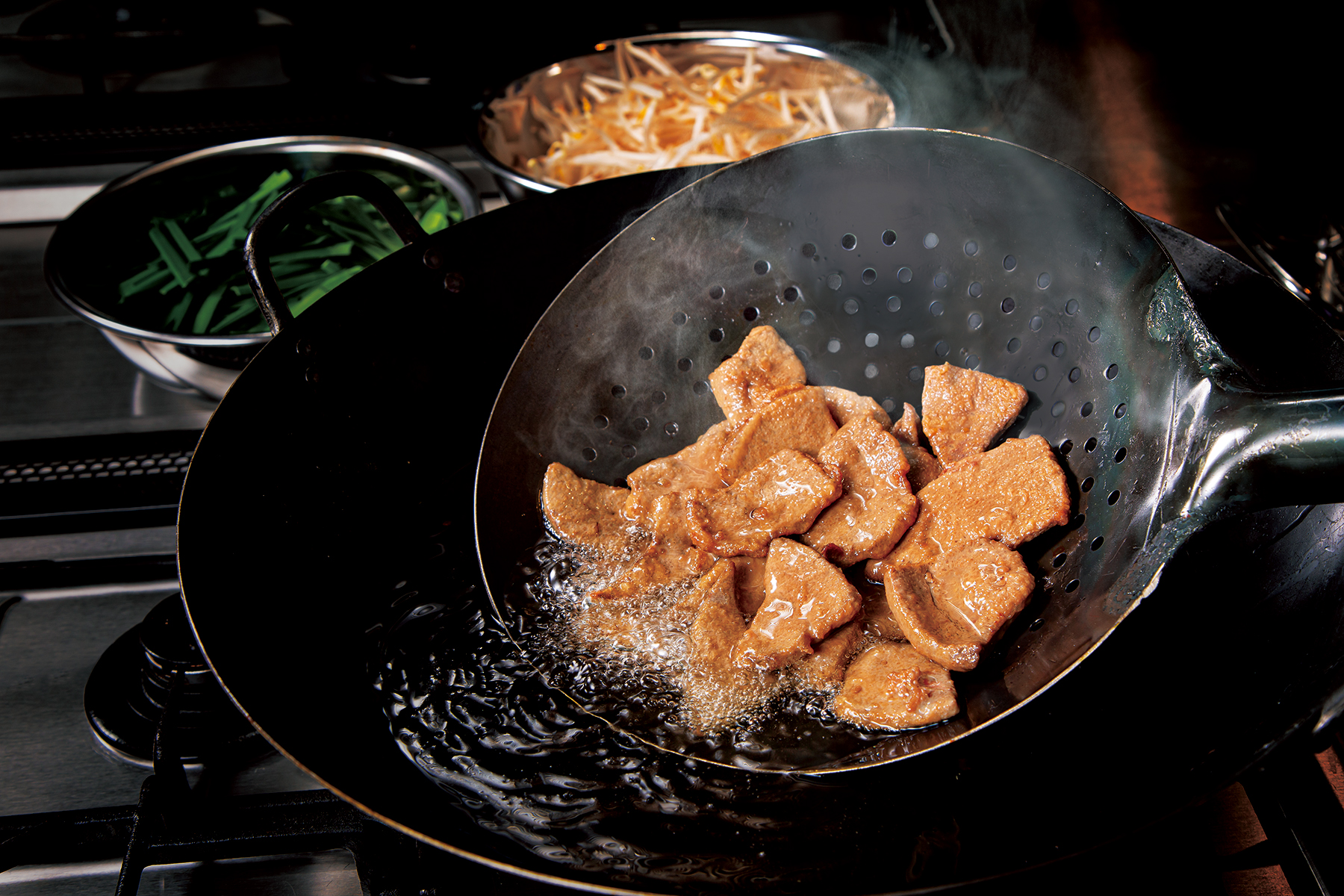 油通しで表面をサッと揚げ固め、中心部は生のままの状態にしていることで、レバー本来の旨みを閉じ込め、柔らかくも弾力のある食感に仕上げました。